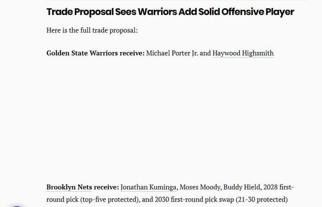 勇士隊(duì)被曝已經(jīng)向籃網(wǎng)隊(duì)詢價(jià)小波特!美媒《heavy》火速曬出5換2潛在交易方案,支招勇士隊(duì)打包賣庫明加+首輪簽?zāi)孟滦〔ㄌ亍?/p>