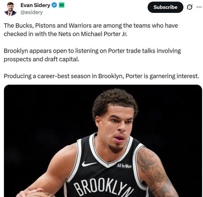 根據(jù)名記Evan Sidery報(bào)道,包括勇士、雄鹿、活塞在內(nèi)的數(shù)支球隊(duì)已經(jīng)向籃網(wǎng)詢價(jià),探索交易小邁克爾波特的可能性,籃網(wǎng)對(duì)此持開放態(tài)度。