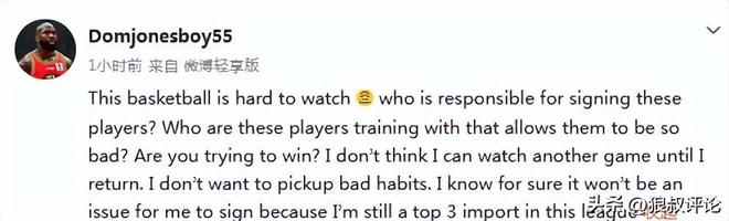 北京時(shí)間1月10日,前吉林男籃名宿外援瓊斯更新社媒發(fā)文:“這場球太難看了。誰負(fù)責(zé)簽的這些球員?誰把他們訓(xùn)練得這么差?你們想贏嗎?在我回CBA之前,我不會(huì)再看這樣的比賽了,我不想養(yǎng)成壞習(xí)慣。我確信簽約對(duì)我來說不是問題,因?yàn)槲胰匀宦?lián)盟前3名?!?/p>