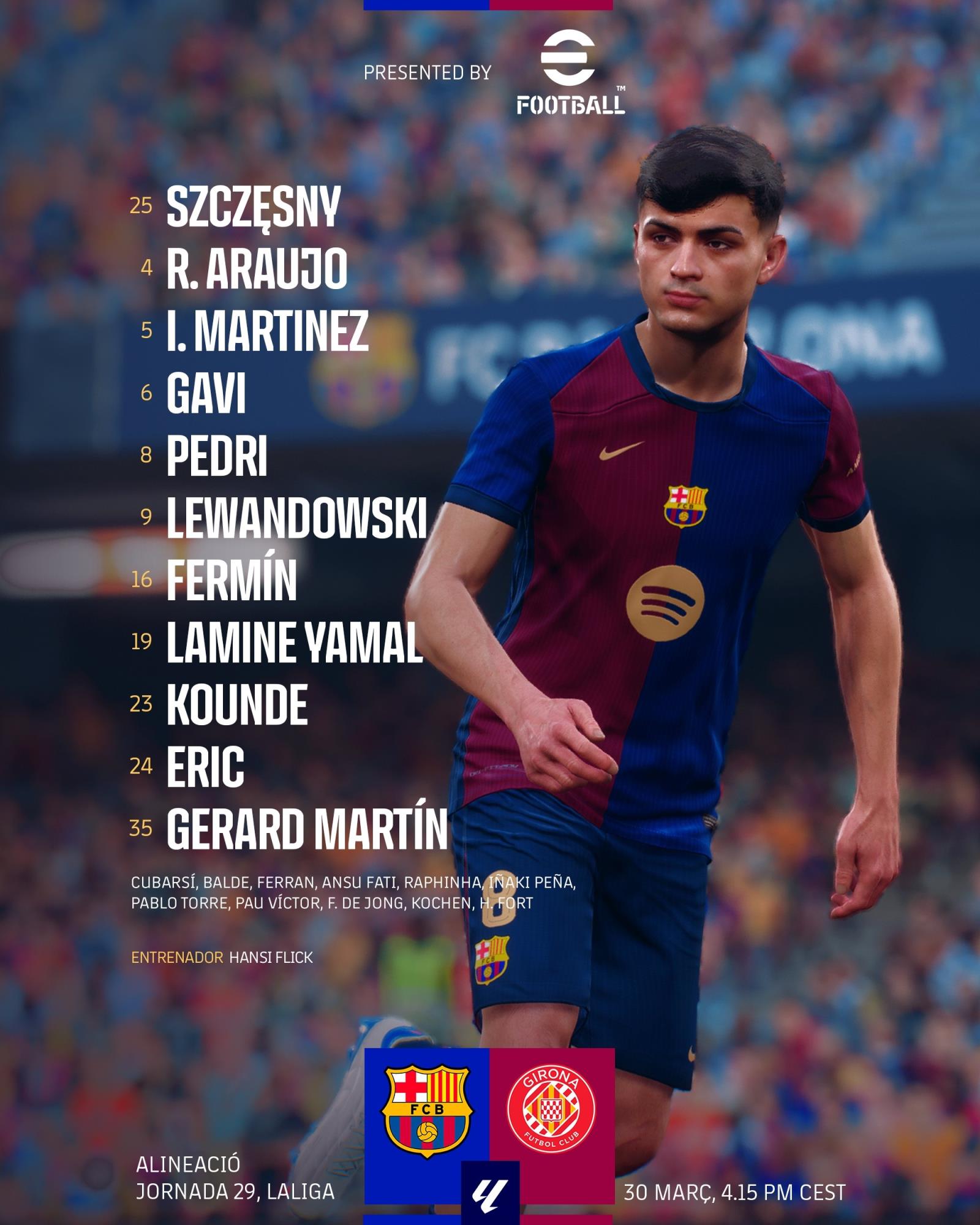 巴薩首發(fā):25-什琴斯尼、4-阿勞霍、5-伊尼戈-馬丁內(nèi)斯、23-孔德、24-埃里克-加西亞、35-杰拉德-馬丁、6-加維、8-佩德里、16-費(fèi)爾明、19-亞馬爾、9-萊萬(wàn)
